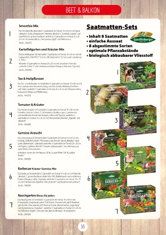 1 „Matador“, Gurke „Marketmore“, Petersilie „Moskrul 2“, Grünkohl „Scarlet“ und • Inhalt 8 Saatmatten